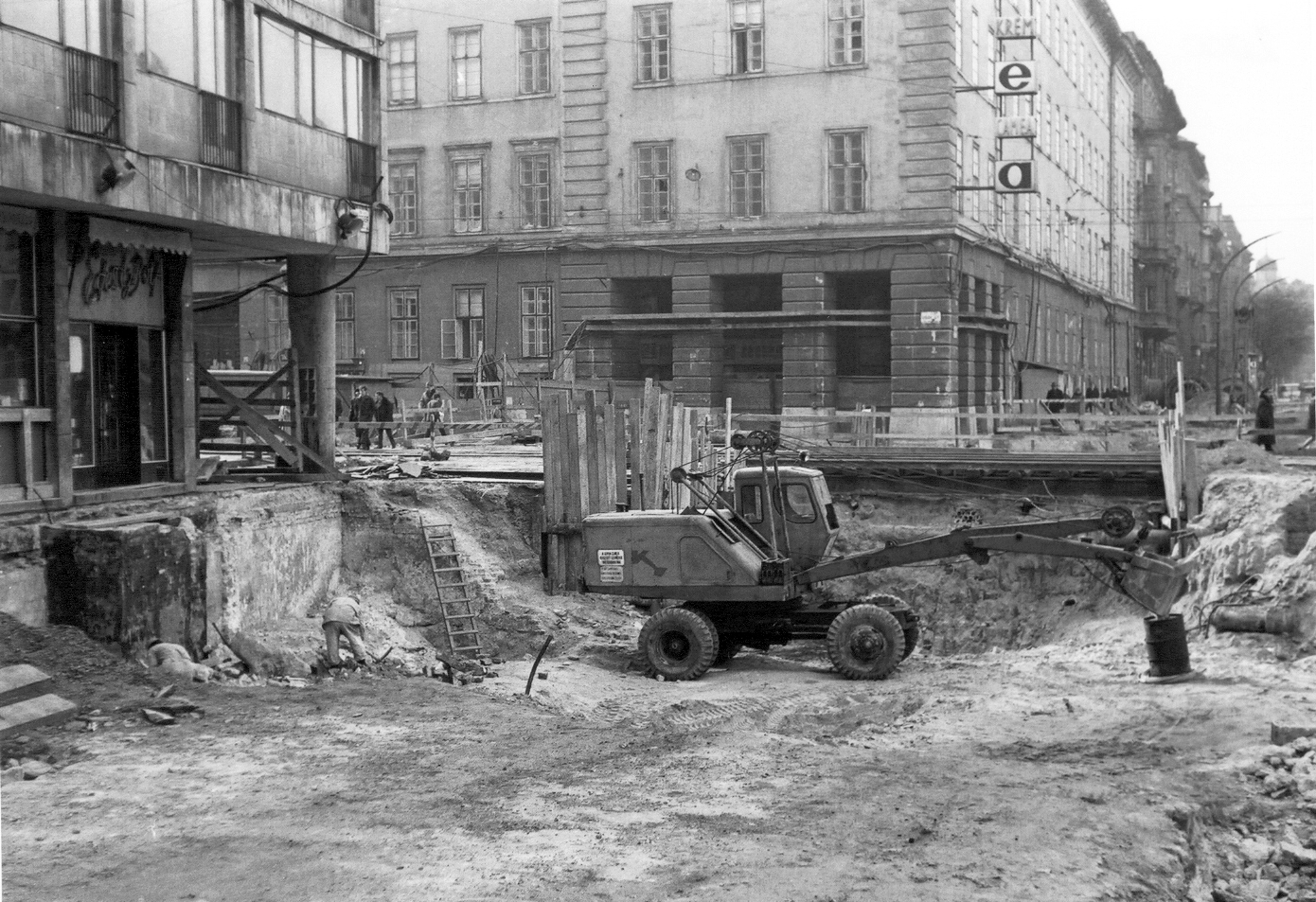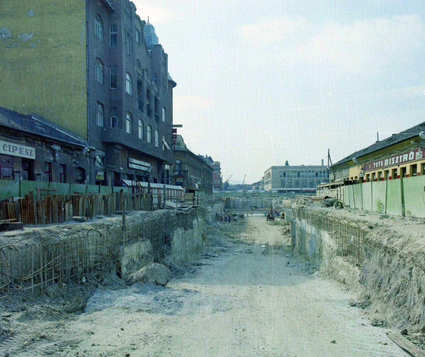 József körút, construction of an underpass at the Üllő út junction. Corvin (Kisfaludy) alley is on the right side, 1970. (Fortepan)