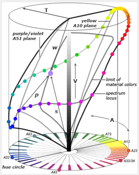 A Coloroid-színrendszer a színérzetek háromdimenziós sokaságát egy álló körhenger belsejében úgy helyezi el, hogy a színezet (A) változása a szögkoordinátával, önmagába visszatérően, a telítettség (T) változása vízszintesen a sugár, a világosság (V) változása pedig függőlegesen a tengely irányába történik.