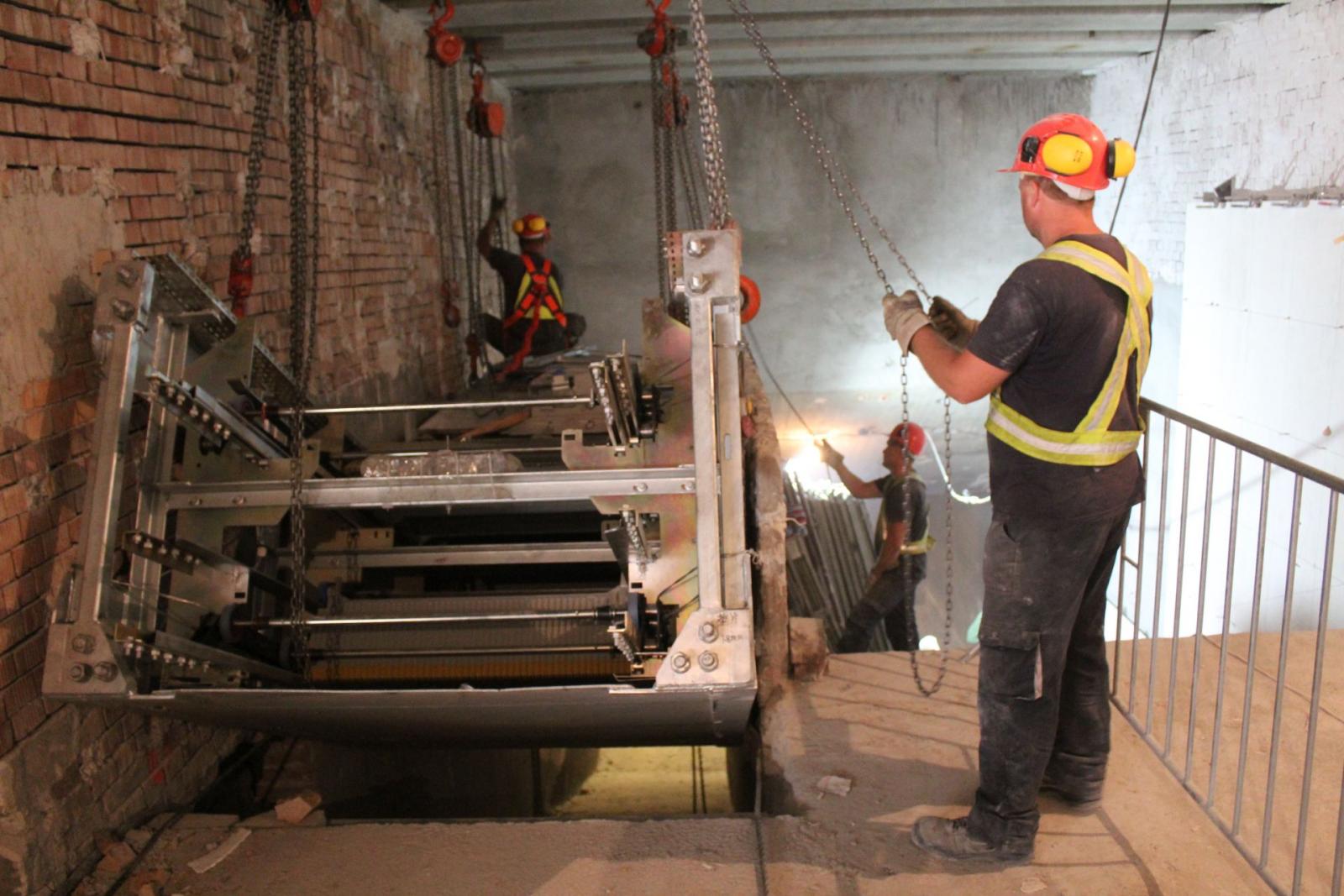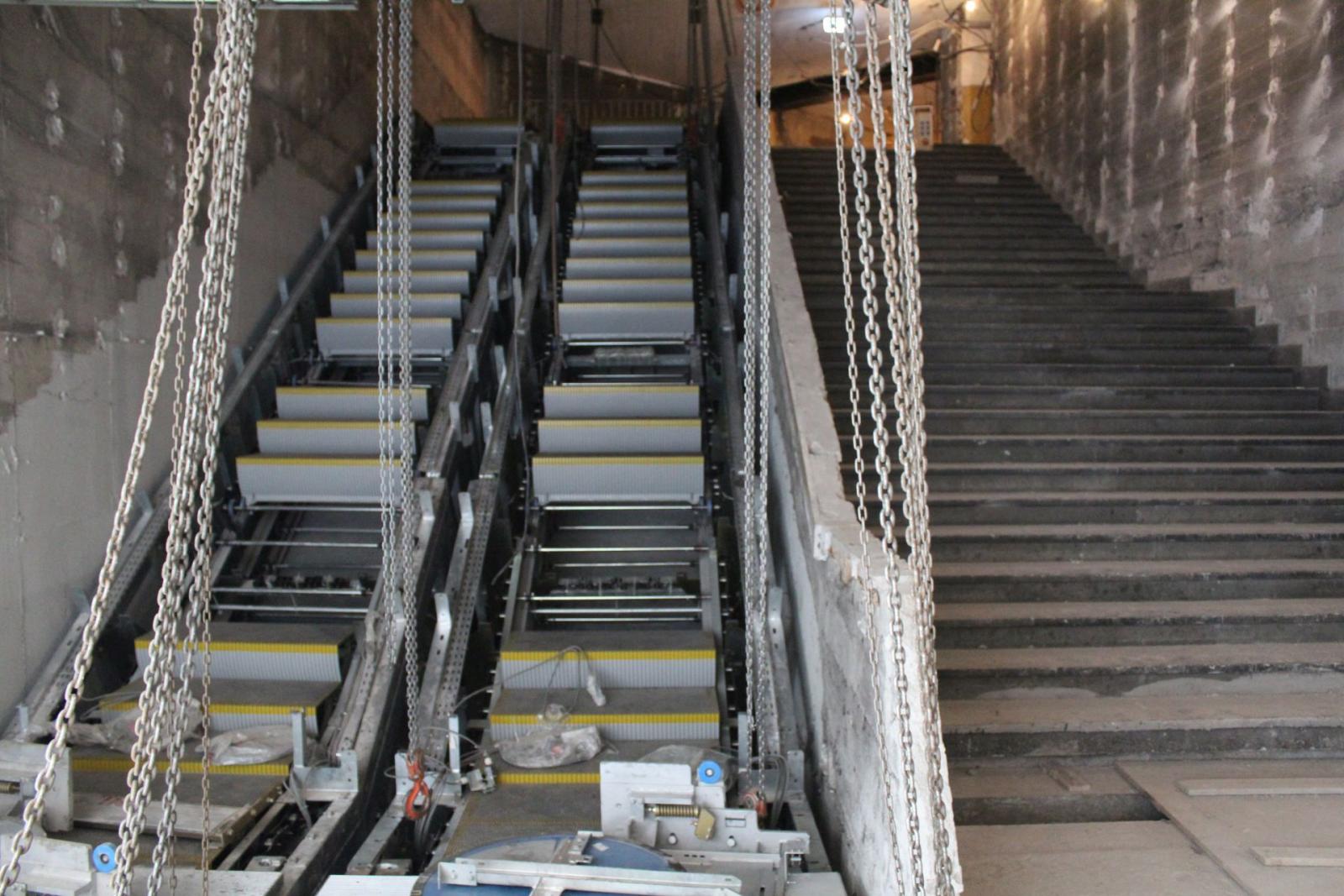 Az új eszközök több különálló egységből állnak, ezek jellemzően az alsó, felső és középső elemek. Egy-egy ilyen elem tömege akár 3-4 tonna is lehet. A helyszínre szállított egységeket ideiglenesen kialakított rámpán keresztül engedik le az aluljárószintre és görgős kocsik segítségével mozgatják a beépítés helyére, ahol a födémben kialakított (a régi lépcsők bontásánál is használt) emelési pontokra felhelyezett kézi mozgatású csörlők segítségével emelik a végleges helyükre azokat.