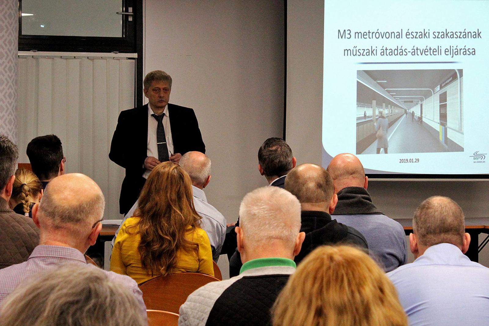 Radnay Tibor metró felújítási projektigazgató beszédet tart a nyitóértekezleten